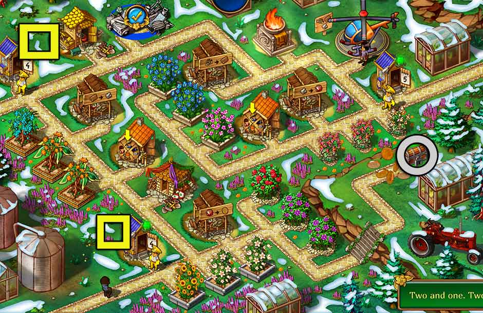 Build the Seed Shack and upgrade it once.11 Clear the paths to the right, have Demolisher collect his TNT, and destroy the rubble.12. Build the Stairs and the Water Shack.13. Collect the Coins to the right of the Water Shack and open the Chest, top left near the Seed Shack.14.